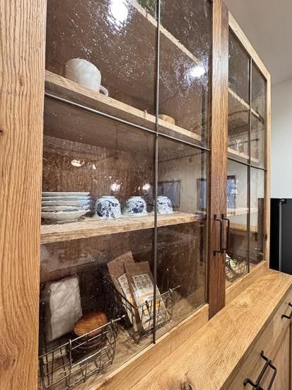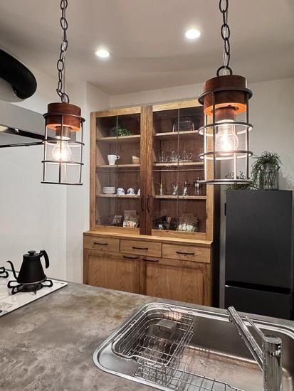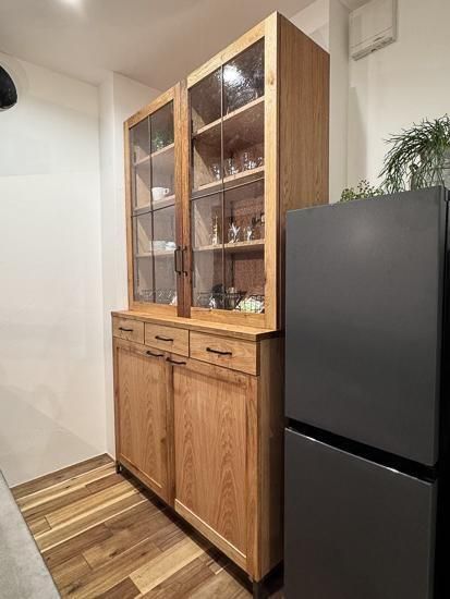 ナラ無垢材の豊かな木目を活かし、フレーム状に組んだ扉とシンプルな黒アイアン金物でシャープさをプラス。上段はアクリル越しにお気に入りの器やグラスを“魅せる”ショーケース、下段は扉&引き出しで“隠す”ストック収納。奥行 465 mm のスリム設計ながら、可動棚と3杯の浅型トレーでキッチン周りを美しく整理できます。
